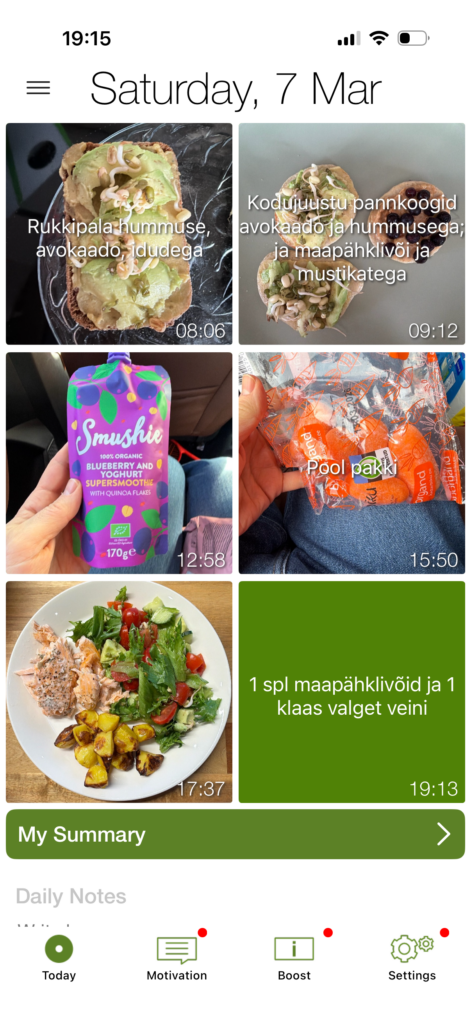 Otsustasin liituda Toitumisnõustaja+ 8-nädalase programmiga, kuna tundsin end pidevalt väsinuna. Mõtlesin, küll erilise usuta, aga siiski väikese lootusega, et äkki tervislik(um) toitumine muudab midagi. Lisaks oli mul ligikaudu aasta pärast lapse sündi jäänud veel paar üleliigset rasedusega lisandunud kg ja grupi toel neist vabanemine tundus toredam kui üksi pingutades. Väike lootus oli, et äkki isegi saan lahti veel mõnest lisakilost ja jõuan väiksema kaalunumbrini kui enne rasedust (aga seda pidasin juba üpris vähetõenäoliseks).